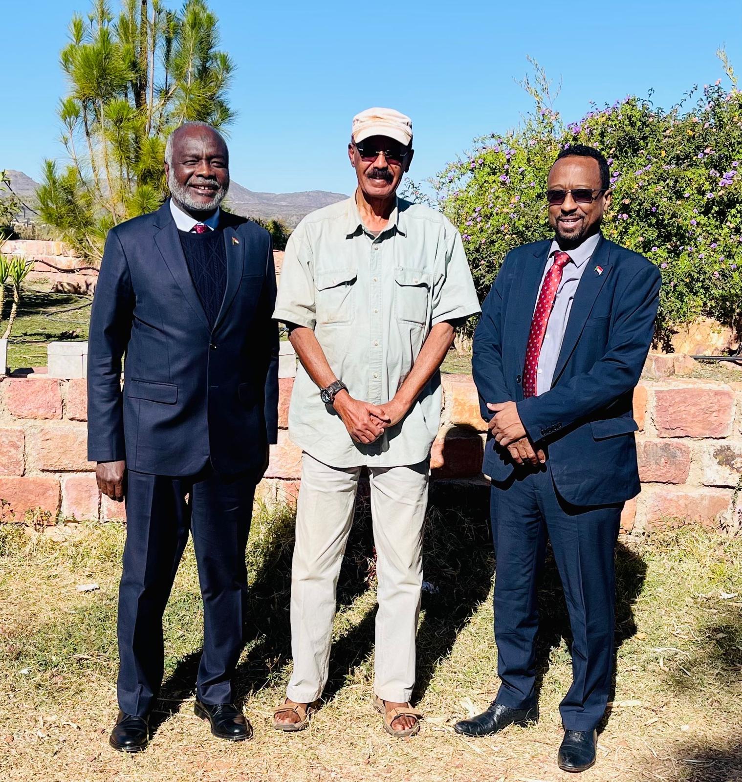 ونقل الوزيران للرئيس الإريتري تقدير حكومة السودان وشعبه للمواقف الإريترية الداعمة، مشيدين بالتسهيلات والرعاية التي تقدمها إريتريا للسودانيين المقيمين والعابرين عبر أراضيها في ظل الظروف الاستثنائية التي تمر بها البلاد، ومؤكدين أهمية المواقف السياسية للرئيس أفورقي الداعمة لوحدة السودان وأمنه واستقراره.