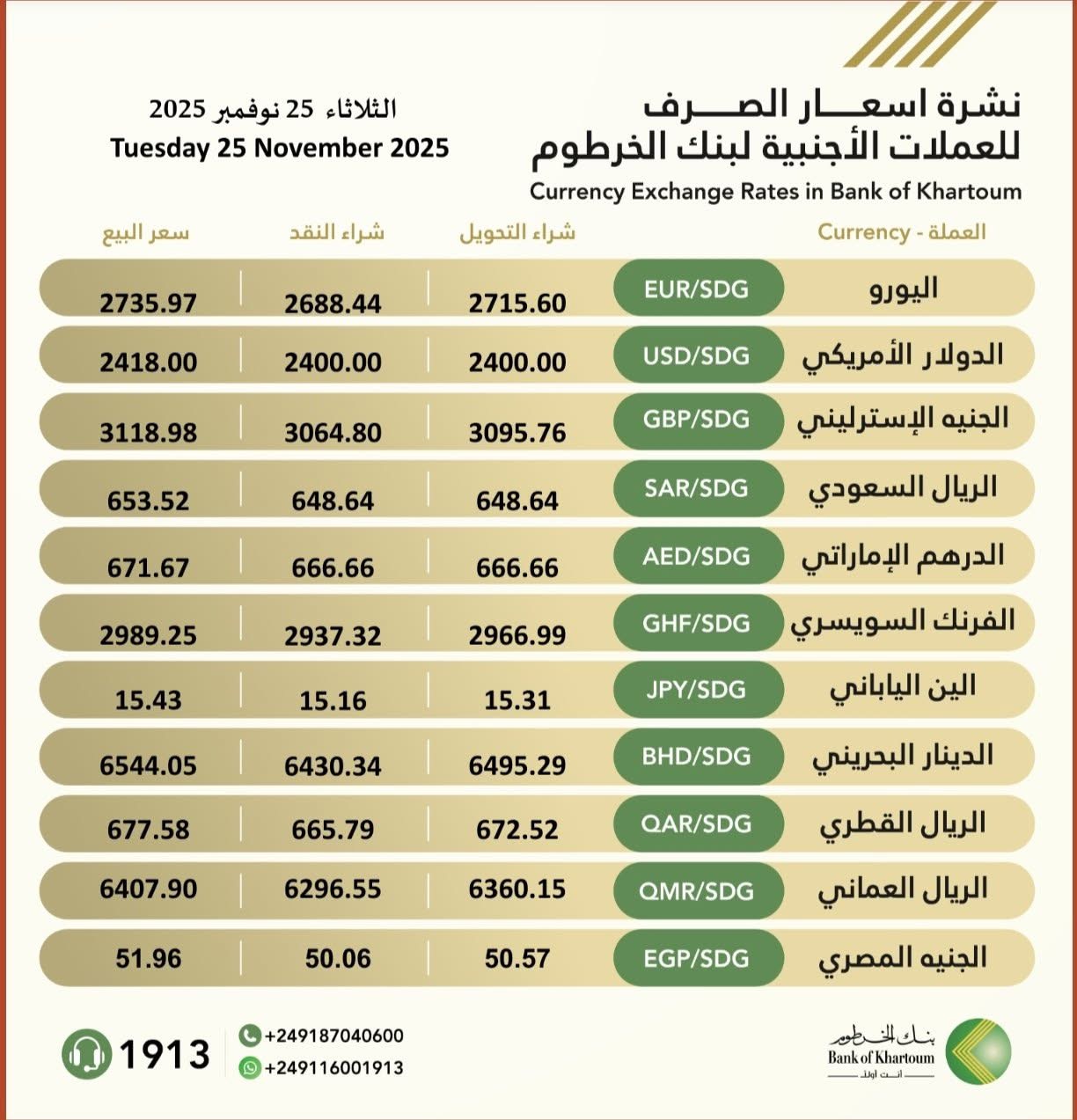 خاص – شهدت نشرة أسعار الصرف الصادرة عن بنك الخرطوم اليوم الثلاثاء 25 نوفمبر 2025، تبايناً في حركة العملات الأجنبية مقابل الجنيه السوداني، حيث سجل الدولار الأمريكي استقراراً عند 2400 جنيه للشراء و2418 جنيه للبيع، في حين واصل الجنيه الإسترليني ارتفاعه متجاوزاً الدولار واليورو مسجلاً 3095.76 جنيه للشراء و3118.98 جنيه للبيع.