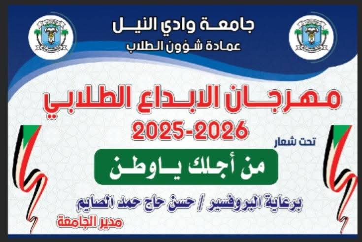 أطلقت عمادة شؤون الطلاب بجامعة وادي النيل مهرجان الإبداع الطلابي تحت شعار «من أجلك يا وطن»، بحضور مدير الجامعة البروفيسور حسن الصائم وعدد من عمداء الكليات ومشرفي الطلاب.