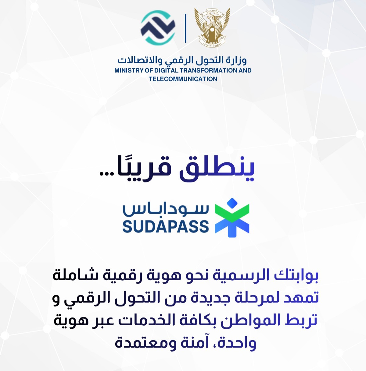 أعلنت وزارة التحول الرقمي والاتصالات عن قرب إطلاق SudaPass، الهوية الرقمية الوطنية الموحدة .