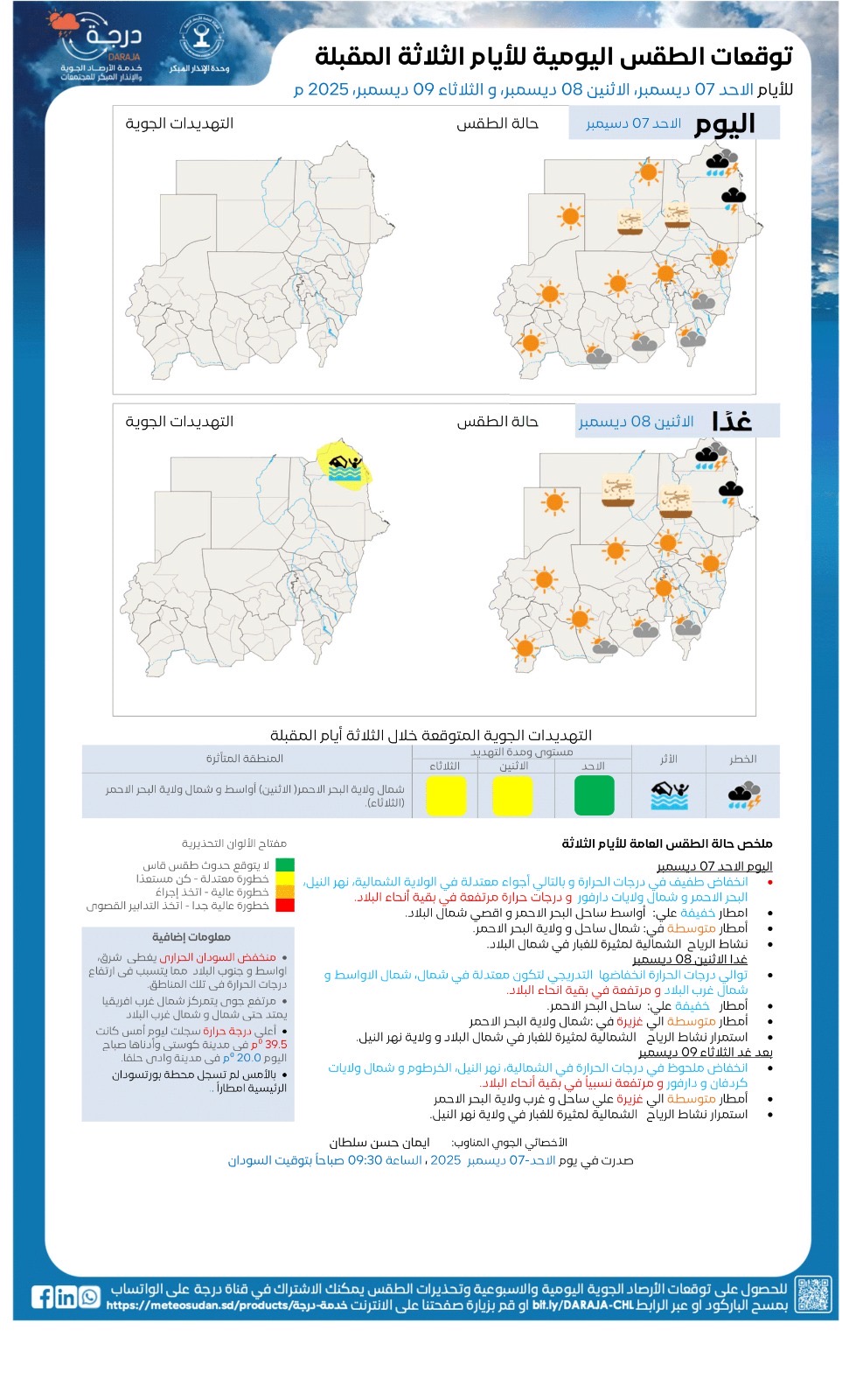 أصدرت الهيئة العامة للأرصاد الجوية السودانية توقعات الطقس اليومية لأيام الاحد07 – الاثنين 08 –الثلاثاء 09 ديسمبر 2025