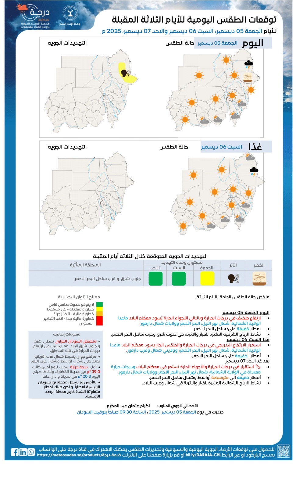 أصدرت الهيئة العامة للأرصاد الجوية السودانية توقعات الطقس اليومية لأيام الجمعة 05 –السبت 06 –الاحد 07 ديسمبر 2025