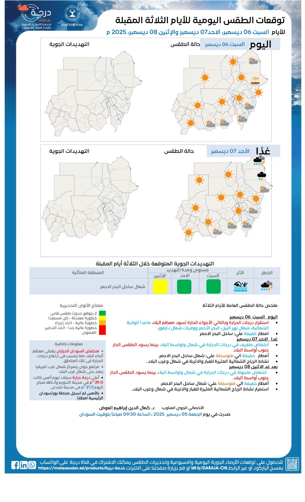 أصدرت الهيئة العامة للأرصاد الجوية السودانية توقعات الطقس اليومية لأيام السبت06 – الاحد -07 –الإثنين 08 ديسمبر 2025