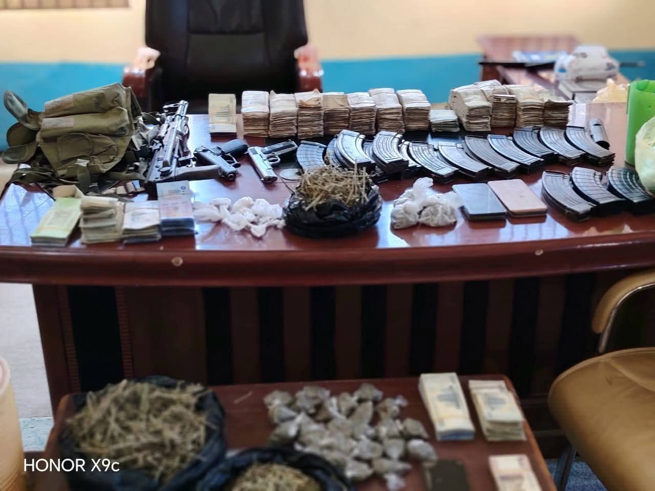 وفقا لمتابعات المكتب الصحفي للشرطة الي توفر معلومة لفريق الميدان بالإدارة تفيد بوجود نشاط إجرامي لاحد مروجي وموزعي المخدرات والسموم وينتحل صفة القوات النظامية علي ضوء ذلك تم تنفيذ عملية مداهمة واسعة النطاق أسفرت عن ضبطه وبحوزته المعروضات بموجب ذلك تم إتخاذ إجراءات قانونية في مواجهته تحت المواد 15/أ والمادة(26) من قانون الأسلحة والزخيرة والمادة (130/20) من القانون الجنائي توطئة لتقديمه للمحاكمة .