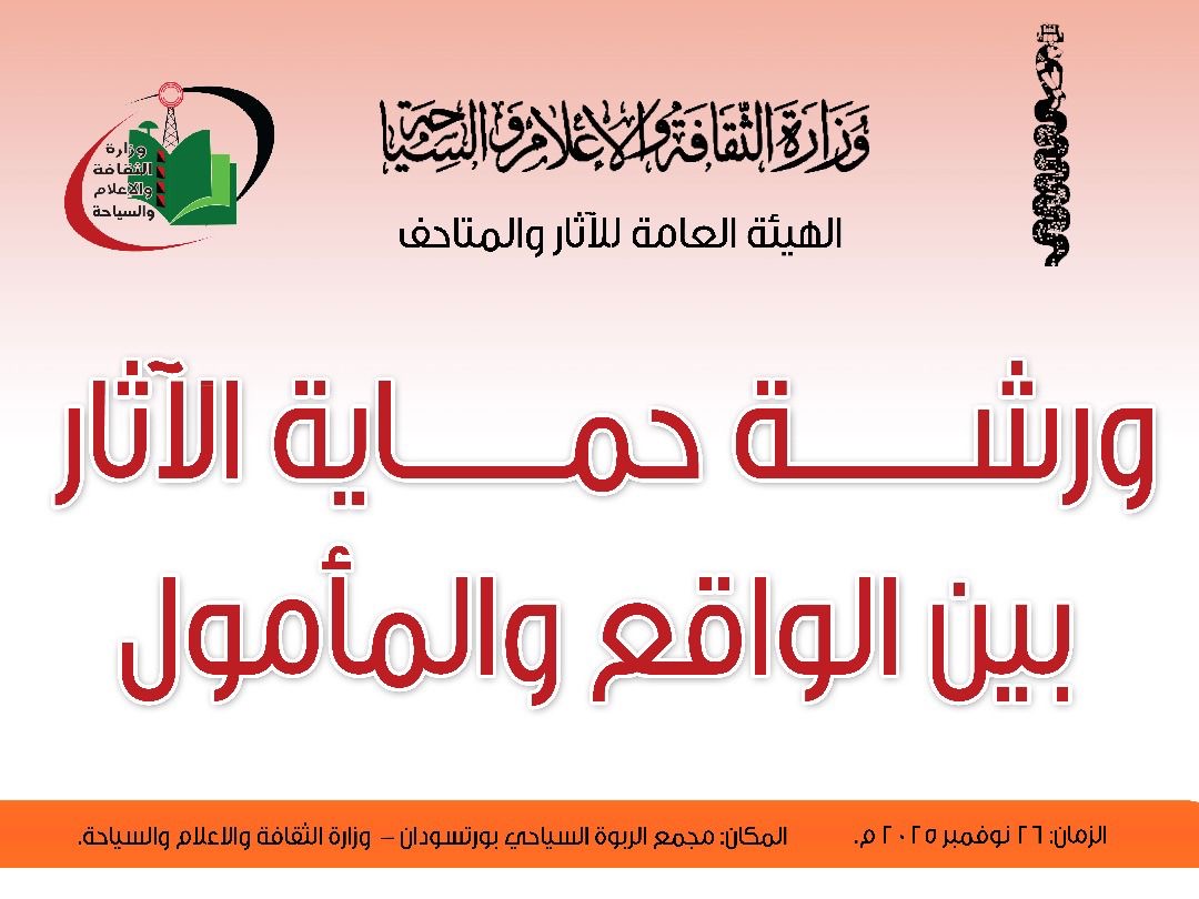 ومن المقرر أن يخاطب الورشة كل من: الأستاذ خالد الأعيسر، وزير الثقافة والإعلام والسياحة، الدكتور جرهام عبد القادر، وكيل الوزارة، الدكتورة غالية جار النبي عبد الرحمن، المدير العام المكلف للهيئة القومية للمتاحف والآثار، البروفيسور عباس سيد أحمد زروق، والأستاذة أمل حسن قسم الله.