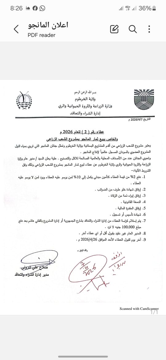 عليه يعلن السيد / مدير عام وزارة الزراعة والثروة الحيوانية والري ولاية الخرطوم عن عطاء لبيع ثمار المانجو بمشروع الشعب الزراعي وذلك وفق الشروط الأتية:-